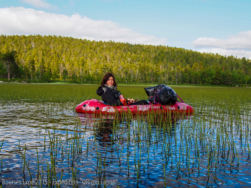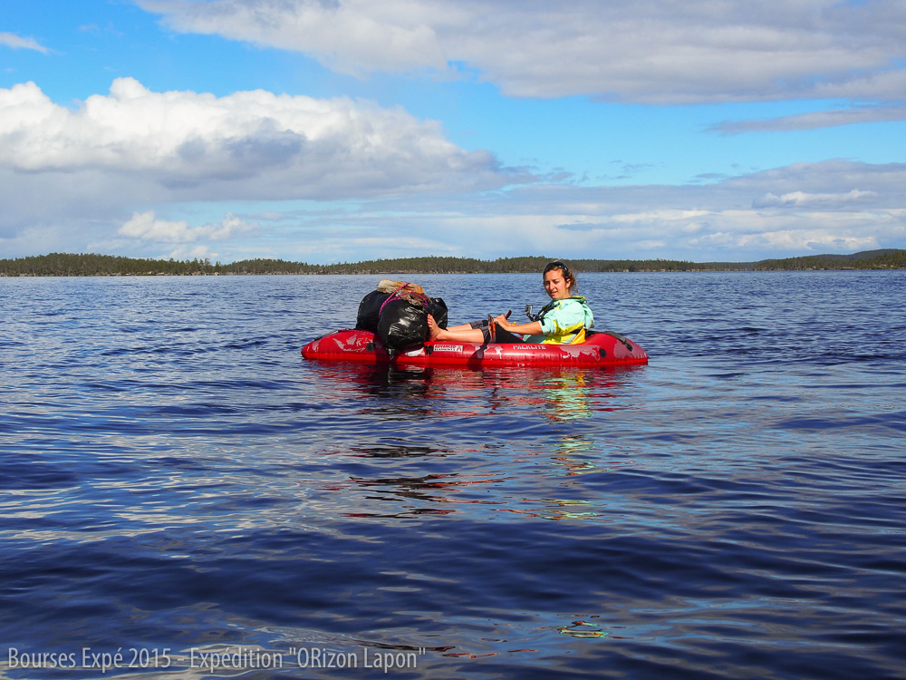 Le réveil du matin est plutôt surprenant. A peine sorties de la tente, nous découvrons deux kayakistes rôdant autour de notre camp. Voici les premières personnes que nous croisons depuis notre départ d’Ivalo. Ils se sont arrêtés surpris de ne pas voir nos kayaks et se demandant comment nous avons pu atterrir sur cet îlot. Nous leurs montrons nos packlites et ils sont surpris de voir ces kayaks gonflables capables de faire de telles distances. Amusées, nous finissons notre route jusqu’à Inari.