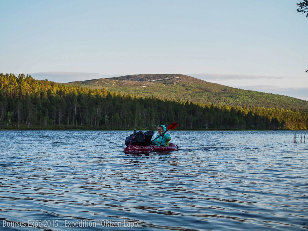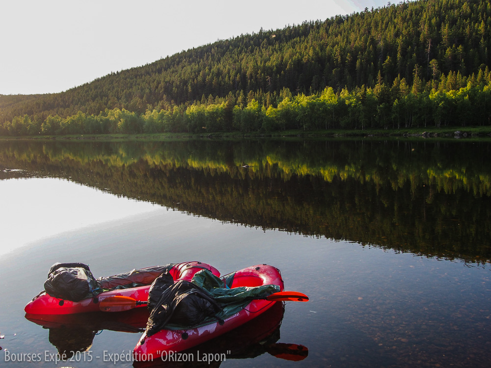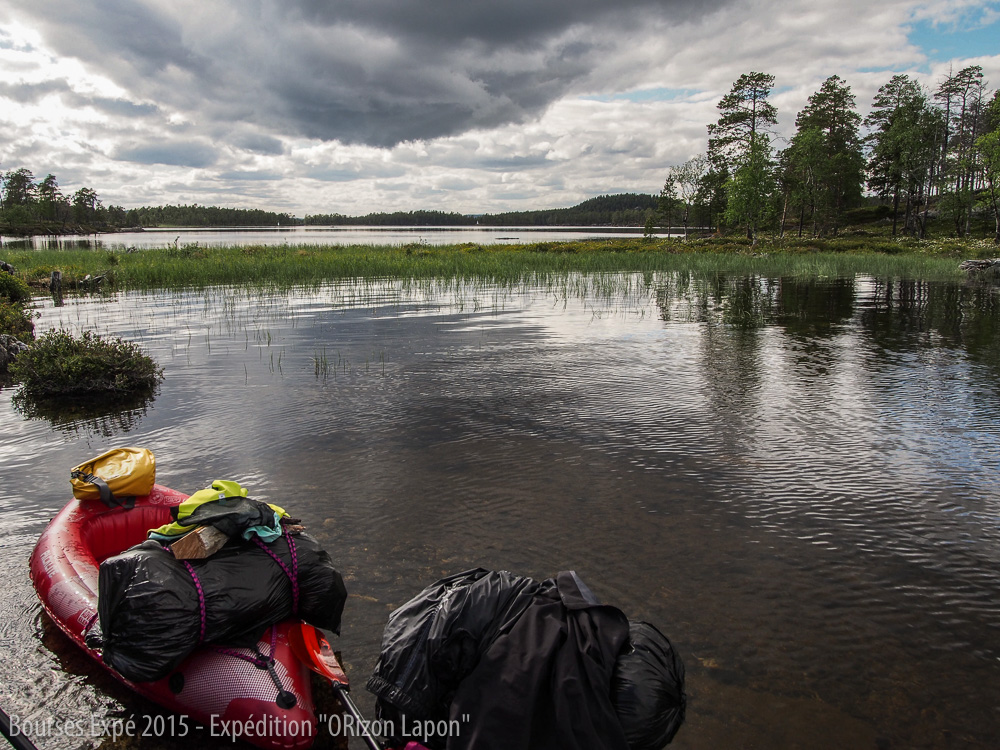 Nous décollons le 25 juin de Paris en direction d’Ivalo au nord de la Finlande. De là, le projet initial est de se rendre dans le Parc national Lemmenjoki en utilisant le moins de moyens motorisés possibles. Ayant prolongé nos dates d’expé dans la région, nous décidons de relier Ivalo-Inari en kayak. Après de nombreux conseils à l’office de tourisme et l’achat de notre carte maritime, nous gonflons nos kayaks pour la première fois. Nous partons en fin d’après-midi et notre première étape est écourtée en raison du mauvais temps. Nous descendons l’Ivalojoki en direction du plus grand lac de Laponie finlandaise, le lac Inari. Les premiers paysages sont encore urbains. Nous suivons de loin une route, et la présence de nombreuses maisons rendent un peu compliqué notre choix de campement pour la nuit. Nous trouvons finalement un terrain plat où les moustiques nous attendent de pied ferme. Nous plantons notre tente sous la pluie avec des moustiques voraces, heureux de nous voir passer la nuit ici. La première journée donne le ton de l’aventure. L’été lapon est maussade et les moustiques malgré le froid et la pluie sont d’attaque.