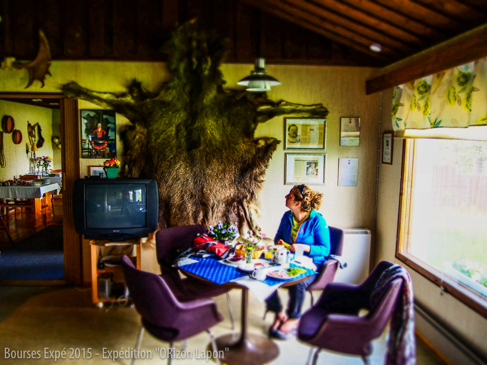Nous la quittons heureuses de ce premier contact et prenons rendez-vous avec elle le lendemain pour un café et une interview. Silja a fait une école de survie pour devenir guide dans la région et a beaucoup à nous apprendre de ses traditions, le mode de vie des lapons mais aussi sur les chercheurs d’or. Nous partons à l’office du tourisme pour organiser notre départ vers le parc national. Nous apprenons que malheureusement il n’y a pas de transport en commun pour s’y rendre. Heureusement pour nous, nous rencontrons Anne qui travaille à l’office du tourisme et habite pas loin de Njurgulahti, point d’entrée dans le parc national. Elle nous propose de nous y emmener le lendemain. Nous sommes surprises par l’accueil si chaleureux et l’intérêt indéniable des locaux concernant notre projet. Nous en profitons pour visiter le musée.
