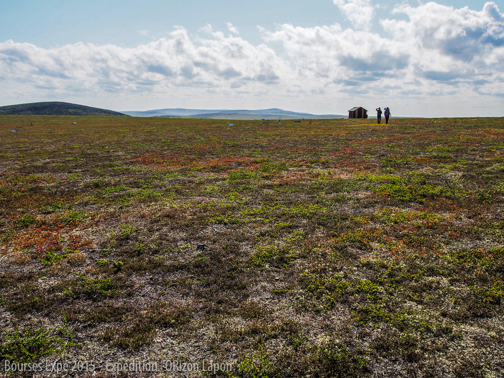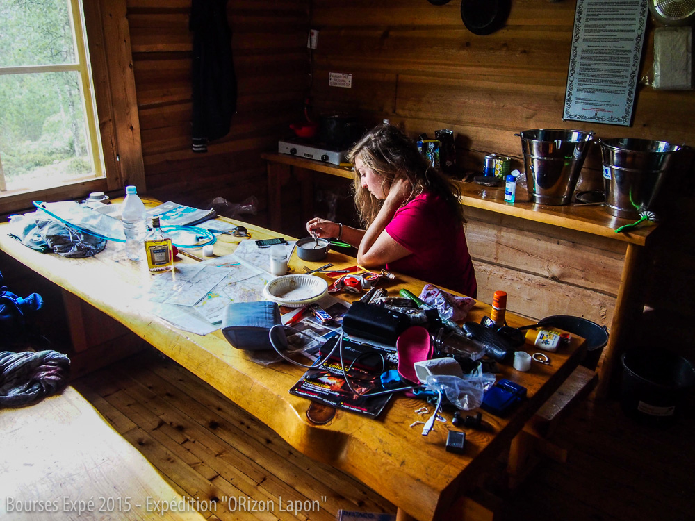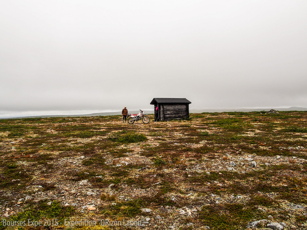 Au vu du brouillard et de la pluie incessante, ils finissent par nous proposer le gîte. A deux pas de leur maison, il y a un grand campement avec de nombreuses cabines. Nous apprendrons plus tard que cet endroit appartenait à l’ex partenaire de Pekka, décédé quelques années plus tôt. Cet endroit est l’un des plus vieux campements de chercheurs d’or dans le parc national. Pekka nous informe qu’il se bat pour préserver cet endroit et le faire déclarer comme patrimoine historique et en faire un musée. En effet, suite à une nouvelle loi, les chercheurs d’or du Lemmenjoki sont menacés. Le gouvernement souhaite l’arrêt de l’utilisation des machines pour l’extraction d’or mais aussi l’exode total des chercheurs d’or présents dans le parc. Une fois délestées de nos sacs, nous partons découvrir la bibliothèque du parc qui est également un aérodrome. Depuis une colline, nous admirons les paysages où le lichen recouvre les montagnes et attire de nombreux rennes. Malgré le brouillard, les paysages sont sublimes. Notre plus grande inquiétude vient de notre batterie d’appareil photo qui tient de moins en moins la distance. A cause du froid, la batterie se décharge vite et vu les conditions météorologiques, nous ne pouvons pas utiliser notre panneau solaire. Heureusement que nos hôtes sont des plus gentils et acceptent de charger notre batterie sur leur groupe électrogène. Nous sommes ravies d’avoir la chance d’être au cœur de l’histoire des chercheurs d’or dans le parc national. Nous apprenons en effet que de nombreuses réunions de l’association des chercheurs d’or mais aussi de nombreuses fêtes de rassemblement se déroulent dans ce lieu où nous passons la nuit, à l’abri de la tempête.