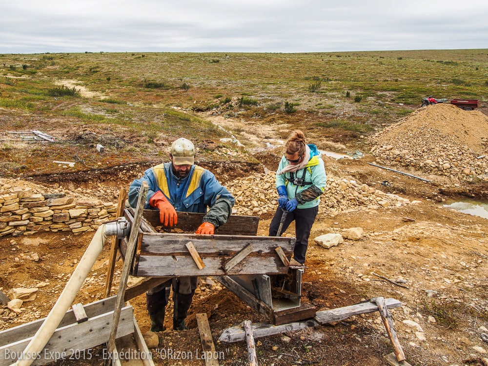 Levées avec un rayon de soleil, nous remercions nos hôtes en faisant le grand ménage de printemps de la cabine et partageons un thé avec eux avant de prendre la route pour la concession d’Aki. Nous nous arrêtons pour demander notre route à un chercheur d’or ne parlant pas anglais. Il va du coup nous accompagner pour le reste de la route dans cet endroit de plus en plus sauvage. Nous avons de la chance de découvrir l’un des campements les plus isolés du parc national. Cela nous permet de découvrir la beauté sauvage du parc naturel qui est ici sans chemin de randonnée et même sans chemin de quad. Nous arrivons et trouvons Aki en plein travail. Il nous attend et ne tarde pas à nous former à son métier. Le froid ne nous arrête pas. Aki est heureux que la glace ait enfin fondu. Nous participons donc à ses premières recherches. Il a fait le choix de travailler de manière traditionnelle, à la pelle. Nous l’aidons en enfonçant la pelle dans la terre, en déversant son contenu dans un semi qui conduit à une gouttière où jaillit l’eau qui triera naturellement les matériaux lourds, les séparant des matériaux plus légers comme la terre ou le sable. En effet, les paillettes et pépites d’or, 19 fois plus lourdes que les autres pierres, seront prisonnières au fond de la gouttière. C’est ce que nous tenterons de trouver lors de l’atelier « Bâtée à la main », dernière étape qui nous permettra par un mouvement circulaire, d’éliminer avec l’eau les éléments légers pour de ne laisser apparaître que les paillettes d’or au fond de ce chapeau chinois.