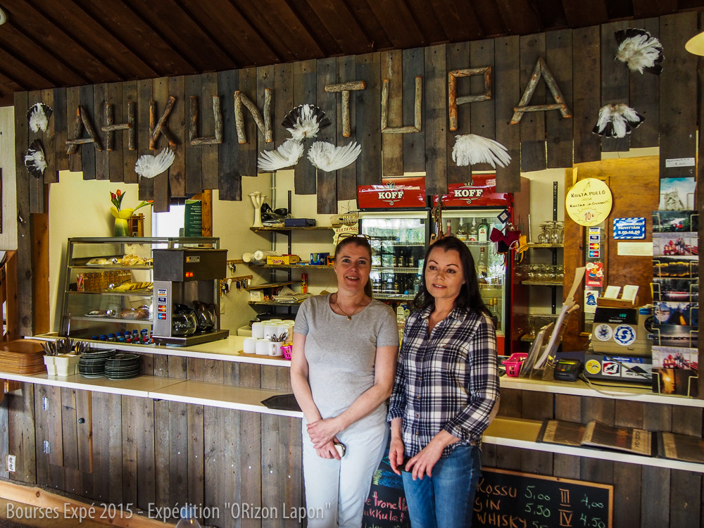Le 4 juillet, nous partons donc avec Anne après sa journée de travail. Nous roulons sous la pluie en direction de Njurgulahti. Là-bas, nous séjournerons a Akhun Tupa. Cette auberge-restaurant est un lieu de passage pour les chercheurs d’or. En effet, pour se rendre dans le parc national, il n’y a pas mille solutions. Seuls huit propriétaires de barques à moteur ont obtenus la licence pour conduire les personnes désirant se rendre dans la parc national, et ainsi préserver la faune et la flore du parc. Ceux-ci doivent emprunter la route jusqu’au village de Njurgulahti avant de pouvoir embarquer dans la barque de Tintin, le mari de Margeeta, l’une des propriétaires d’Akhun Tupa. Nous avions déjà contacté par mail Akhun Tupa, désireuses de trouver des sponsors locaux pouvant nous prêter les kayaks. L’accueil fut cordial et les sœurs d’Akhun Tupa ne tardent pas à nous reconnaître et nous dire à quel point elles ont aimé notre projet et souhaitent nous aider à leur échelle.