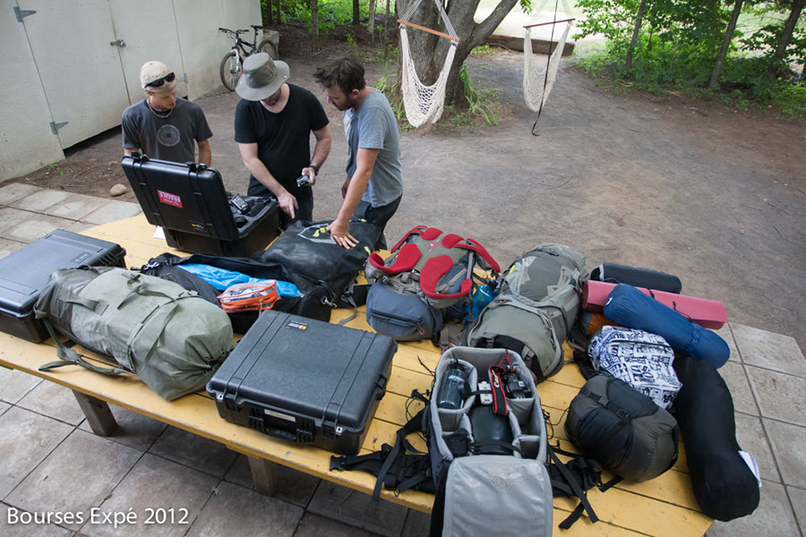 30 juin. Vérification du matériel vidéo et photographique dans la chambre d’hôtel. Une panne de micro et un matelas de sol à remplacer. Ben est arrivé. Guillaume (Guillaume Lafleur) est en préparation et nous rejoint demain à l’hôtel pour se poser chez lui une journée afin de finir les préparatifs. Ben, Simon et Guillaume ne se connaissent pas. En effet, je suis le seul à connaître mes 3 coéquipiers. Simon depuis 15 ans, Ben et Guillaume depuis à peine un an. Ils m’ont fait confiance pour cette aventure qui anime en chacun de nous une volonté personnelle. Ben, l’envie d’en démordre avec les fantasmes qu’il nourrit depuis son enfance sur le grand nord canadien. Guillaume, l’envie folle de découvrir l’eau vive de la rivière Koroc. Une rivière très difficile d’accès. Je suis personnellement obsédé depuis 1 an et demi par l’inspiration d’aller photographier cet écosystème montagnard arctique mythique et méconnu. En effet, les conditions climatiques et les sols spécifiques, encaissés dans ces vallées glaciaires, facilitent l’implantation d’une végétation boréale et d’une faune unique en son genre. Je pense au loup du Labrador, aux caribous montagnards et ours noirs des Monts Torngat. Des espèces endémiques. Simon à été emballé par mon récit de projet et je n’ai pas eu beaucoup de difficulté à le faire adhérer, caméra au poing.
