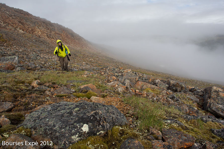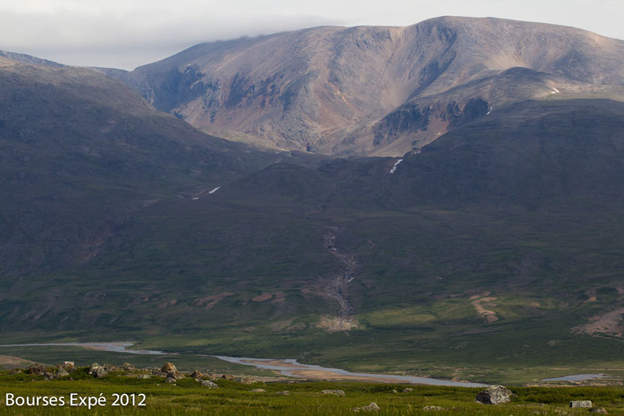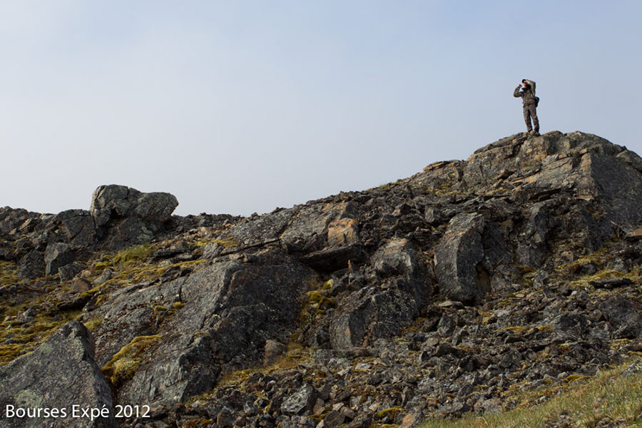Originellement, ce projet consistait à explorer la chaîne de montagnes des monts Torngat (d’est en ouest) située au nord du Labrador et du Québec, soit dans la partie septentrionale des régions communément appelées Nunavik et Nunatsiavut. Le point de départ se situait à la source de la rivière Koroc afin de pouvoir transporter le matériel nécessaire à l’expédition et de s’arrêter aux endroits d’intérêt écologique et paysager remarquable, afin d’explorer par des randos cet écosystème montagnard arctique méconnu. De nombreuses espèces endémiques comme le caribou montagnard des monts Torngat et l’ours noir du même nom sont présents dans ces vallées. Nous espérions également apercevoir le mythique loup du Labrador, plus massif et large que le loup gris et arctique, qui vit sur les hauts plateaux. Malheureusement, pour ce dernier, nous n’avons observé que les pistes laissées dans les dunes de sables datant de l’érosion de la dernière ère glaciaire, et désormais visibles suite au retrait des eaux du lac qui s’était formé là il y à quelques milliers d’années. L’observation de la faune, dans cette immensité sauvage, a été difficile. Des centaines d’indices de présence comme des traces, des panaches au sol, témoignaient de la présence de l’ours noirs, polaire, loup gris et du Labrador, lièvre arctique, lagopèdes alpins et caribous montagnards. Nous avons observé de nombreuses compagnies de lagopèdes alpins, des dizaines d’ours noirs des Monts Torngat et quelques caribous montagnards extrêmement furtifs, craignant loups et Inuits qui chassent depuis des temps ancestraux sur ces territoires. L’ours polaire, qui règne sur ces lieux de bout du monde, a été observé une fois depuis l’avion de brousse que nous avions affrété pour nous rendre sur le plateau de la rivière Koroc. Nous avons réalisé de très nombreux randos, sur des sommets allant jusqu’à 1450 mètres d’altitude et de nombreux plateaux. Le climat arctique et montagnard a fait osciller les températures entre 2 et 28 degrés Celsius. L’équipe était merveilleusement composée et ce fut une expérience sociale très riche si loin du reste du monde. À part au village Inuit de Kujjuak, la capitale du Nunavik, au début et à la fin du voyage, et au village Inuit de Kangiqsualujjuaq dans la baie d’Ungava, nous n’avons croisé aucun être humain. Une nature à l’état pur. Des montagnes érodées où affleure un des boucliers rocheux les plus anciens répertoriés sur terre, 3,9 milliard d’années.