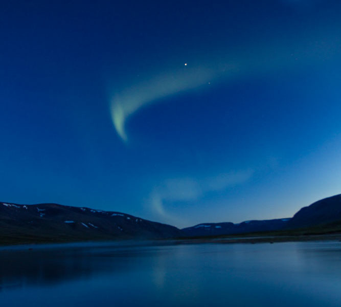 KOROC - 9 juillet. Petites aurores boréales au dessus de la rivière koroc aux alentours de minuit. La lueur du jour est encore visible à droite de l’image.