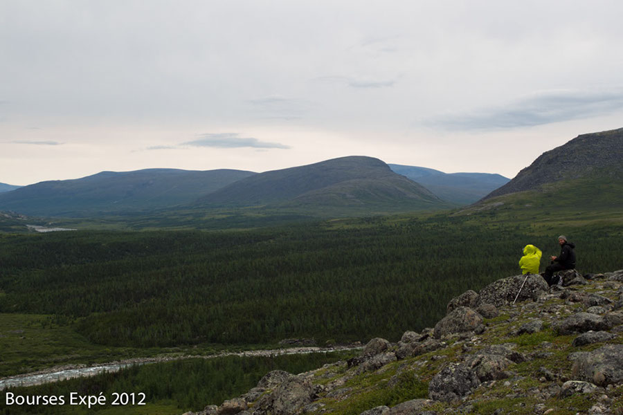 KOROC - 14 juillet. Benjamin et Simon devant les peuplements d’épinettes noires et de mélèzes les plus septentrionaux de l’est de l’Amérique du nord. Chaine des monts Torngat.