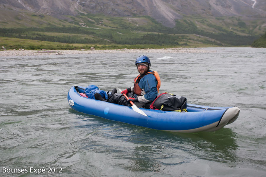 20 juillet. Le camp est plié à 5 h du matin et nos premiers coups d’aviron sont donnés à 5 h 30. Le soleil perce tranquillement une épaisse brume. Nous en profitons. Nous mangeons sur les embarcations et nous avançons. Ça ne va pas durer. Entre les rapides, la rivière s’élargit rapidement et une brise se lève de face, continue et stable. Nous nous relayons les uns derrière les autres. Le stress a parlé et nous poussons dans ces conditions une trentaine de kilomètres. Un superbe rapide nous accueille enfin et une descente aisée de quelques kilomètres s’ensuit. Un autre lac et le courant accélère. Bruit infernal ! Nous devons reconnaître ce RV. C’est à pied que nous nous approchons des eaux bouillonnantes. Nous sommes crevés et nous marchons difficilement le long de la rivière. C’est impressionnant mais il y a une belle veine d’eau. Nous déchargeons seulement le matériel que nous portons jusqu’à la rupture du bouclier rocheux. D’abord les deux kayaks, prudemment. Bien à gauche du rapide qui revient violemment sur lui-même. Je suis sur la rive avec une corde, prêt à la lancer au cas où ils feraient une fausse manœuvre. Ben passe. Je ne vois plus que le casque sombre dans l’eau blanche. C’est bon. Il s’arrête 40 mètres plus bas dans le contre courant. Guillaume suit la même trajectoire. Même scénario. Pas de casse. Il faut retourner chercher le raft. Simon, Ben et Guillaume vont descendre. Je reste avec cordes et appareils photos sur ma roche, en me disant que c’est une très belle journée pour affirmer mon statut d’homme sage et accompli, qui mise d’abord sur la prudence, bien entendu. Le raft ne passera pas dans la petite veine empreintée par les kayaks. Il passera plus au centre et il brassera en conséquence. Je compte sur l’expérience de Guillaume pour que l’aventure ne finisse pas dans la compréhension des cycles biogéochimiques de la région… Mais ils sont beaux à voir. Ils passent. Ils rient. L’endroit est magique. Nous décidons de rester là quelques jours. Il nous reste encore une soixantaine de kilomètres jusqu’à l’estuaire mais tant pis. Les tentes posées sur le roc, à 10 mètres du rapide conquis, les cernes sous les yeux, nous nous affairons aux tâches du camp. Le soleil est éclatant mais il fait frais. Je file à la pêche avec Guillaume. L’eau est profonde, translucide et bouillonnante. Je lance en parallèle des remous. J’aperçois quelques ombles arctiques qui attendent un moment opportun pour franchir l’obstacle du rapide. De nombreux lancers mais rien. Pas même une petite mouchetée. Soudainement un poids au bout de la canne. Je ferre énergiquement. Un départ. Le frein du moulinet siffle immédiatement et je me mets à marcher le long de la rive pour suivre ce poisson qui profite du puissant courant. 100 mètres plus bas et 20 minutes plus tard, je le vois enfin dans 50 centimètres d’eau calme. Un omble arctique d’environ 70 centimètres. Il repartira comme une fusée encore 3 ou 4 fois avant que je puisse m’en emparer dans une zone peu profonde. Superbe. Il fait sans doute 5 ou 6 kilos. Quelle journée ! Ça n’arrête pas. La lueur tombe. Un ours noir longe la rivière. Il a du sentir le poisson. Le ciel est tellement dégagé que je peux faire des photos jusqu’à presque minuit. Je me laisse tomber sur mon matelas une heure et je réveille mes compagnons.