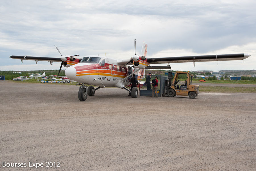 3 juillet. Enregistrement décollage. Droit vers le nord. Zone tempérée, boréale, subarctique, toundra. Je vois par le hublot la Baie d’Ungava. 1ère étape. À peine sortis de l’avion nous allons vérifier l’état du matériel préalablement envoyé et stocké dans les entrepôts de la compagnie. Nous n’avons même pas eu le temps d’annuler le charter mais cette fois l’organisation du nord est souple. Les imprévus font légion ici. C’est leur royaume. Décollage officiel demain matin 8 h 00. Le soir venu, nous profitons une dernière fois de l’eau courante et de l’électricité. Recharge de batteries. Appareils photo, cameras tout est ok. Mais où est la batterie du téléphone satellite ? Les 4 caisses Pelican sont vidées une fois, deux fois, lapin ! Plus de batterie pour l’Irridium. Pas de téléphone satellite, pas d’expé. C’est une folie. Retour à la case départ. Dans cette capitale du nord de 1500 habitants, pour la plupart Inuits, une batterie d’Irridium 9555 c’est, c’est comment vous dire ? Guillaume pense à un ami qui pourrait lui en envoyer une de Montréal dans un délai de 24 ou 48 heures… Cette fois-ci, je suis rempli d’inquiétude. L’effet boule de neige sur les évènements est visible. Je vois Simon et Ben, déjà perdus dans ce village, fraichement arrivés de grosses villes françaises, qui n’ont en réalité aucune idée où nous allons. Je me demande réellement ce que nous sommes en train de faire. Ville du nord dit urgence aérienne et administration gouvernementale quelque part. Je pense à l’hôpital. À la pénombre tombante, nous courrons Kujjuak dans tous les sens pour trouver un téléphone satellite. Ce sera la corporation Makivik qui nous viendra en aide en nous prêtant un téléphone disponible. J’espère que les « petits » imprévus vont s’arrêter.