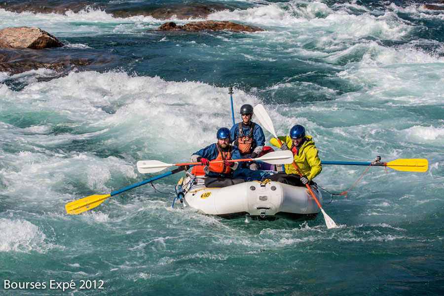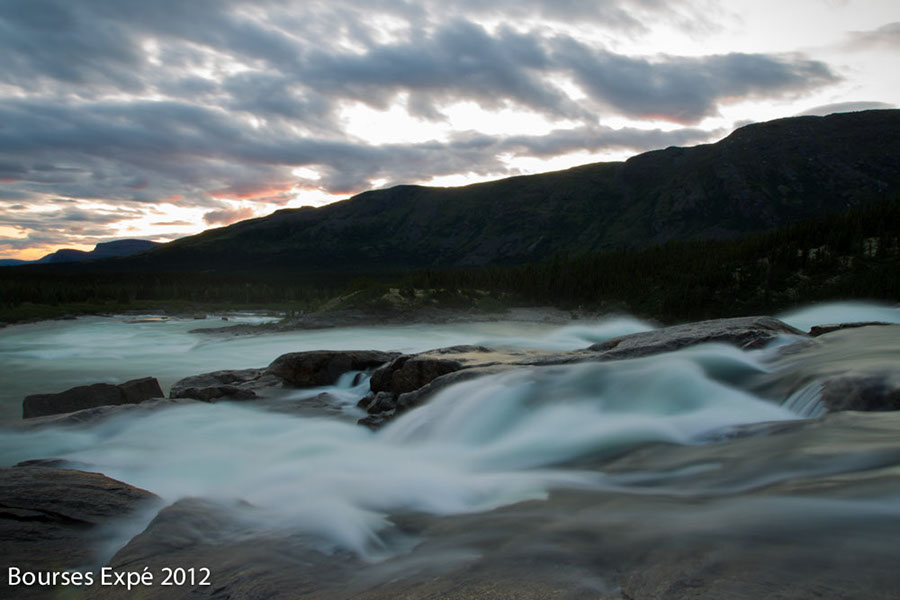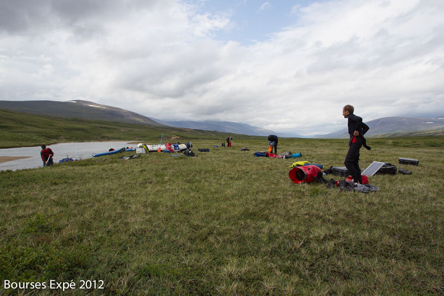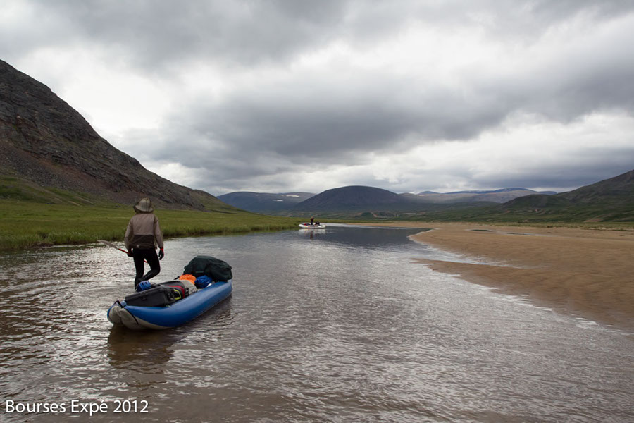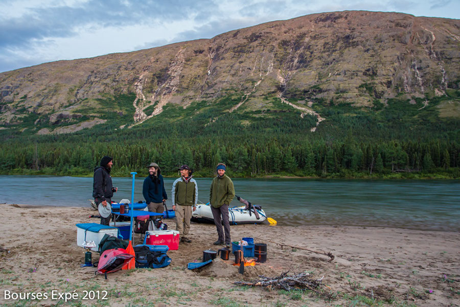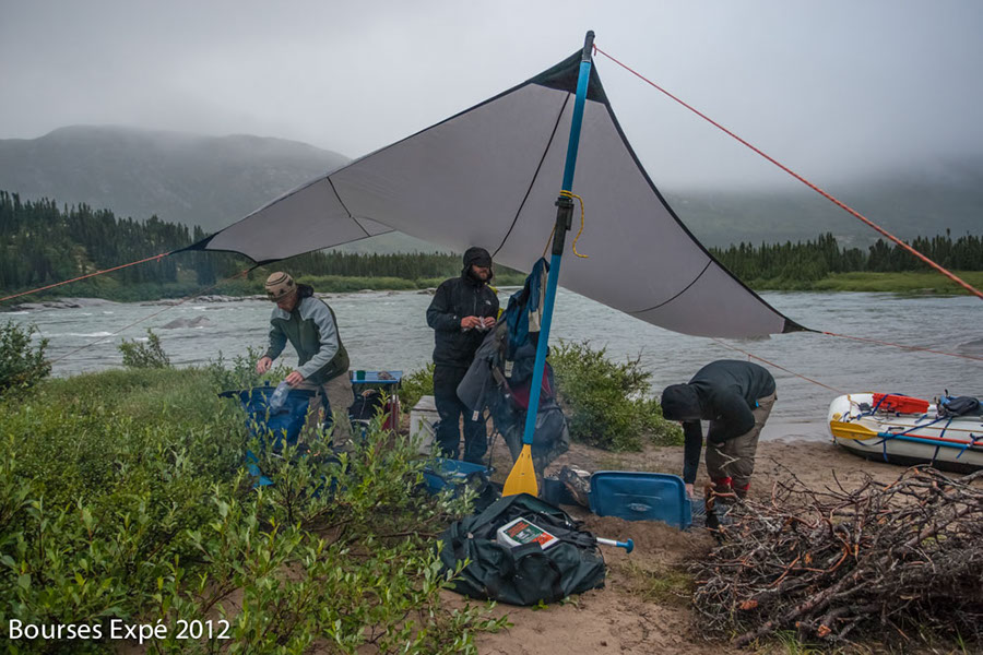 13 juillet. De grosses difficultés de descente de rivières s’annoncent. Rapides et champs de roches sur 2 fois 10 kilomètres. Nous en couvrirons 25. Trouver des veines d’eaux assez profondes pour flotter sans portage, est un défi. Le lit est chaotique, rempli de milles roches irrégulières. Si ce déluge n’avait pas eu lieu, l’expédition serait restée bloquée là pendant des jours. Je n’ose même pas y penser. Une tonne de matériel à 4, sur 20 kilomètres par voie terrestre, dans la végétation des berges irrégulières… ce n’était même pas envisageable. Les jours d’immobilité initialement prévus pour des problématiques de navigation n’auraient pas suffit. Je me rends soudainement compte comme nous sommes vulnérables et à la merci des éléments dans un milieu sauvage aussi isolé. Je me mets soudainement à observer le soleil et le beau temps d’une autre façon. Si cette rivière monte vite, elle peut descendre tout aussi rapidement. On passe la majorité de la journée les pieds dans l’eau à tirer nos embarcations, mais au moins, elles flottent. Nous nous en sortons comme des petits chefs malgré quelques frayeurs. Le soir venu, une superbe plage de galets nous appelle. Les tentes se montent. Le réchaud au naphte est foutu. Cuisine sur feu de bois matin, midi, soir à partir de maintenant. Nous sommes dans le premier tiers de l’expédition et j’ai peur de perdre un temps précieux avec cette nouvelle donnée. Après tout, tout m’échappe. Peu importe.