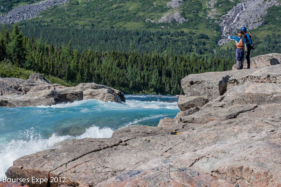 KOROC - 20 juillet. Benjamin et Guillaume reconnaissent un rapide. Rivière Koroc Monts torngat. Nunavik.