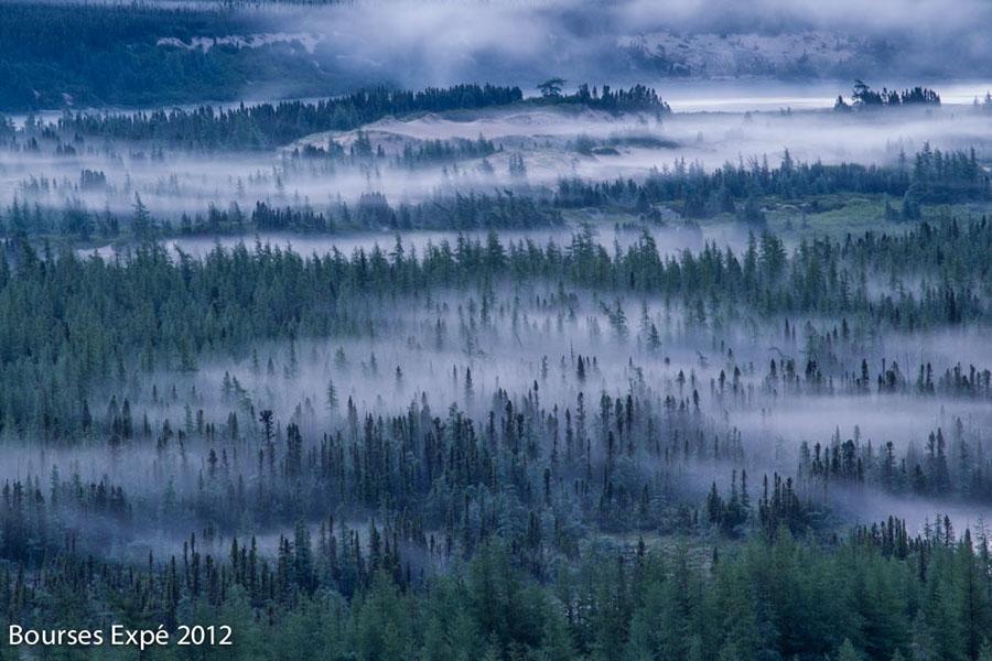 KOROC - 21 juillet. Forêt boréale couverte de brume sur le plateau alluvial de la rivière Koroc aux environs de 3 h du matin. Forêt Boréale la plus septentrionale de l’est de l’Amérique du nord, encaissée entre les Monts Torngat. Mélèzes et épinettes noires se mêlent entre les tourbières et les dunes de sable de la terrasse alluviale. Nunavik.