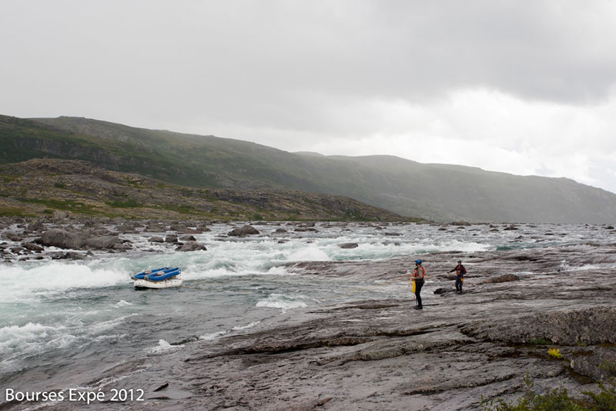 KOROC - 23 juillet. Benjamin et Guillaume se préparent à tenir le rafting de la berge avec des cordes sur un rapide trop dangereux. Nunavik.