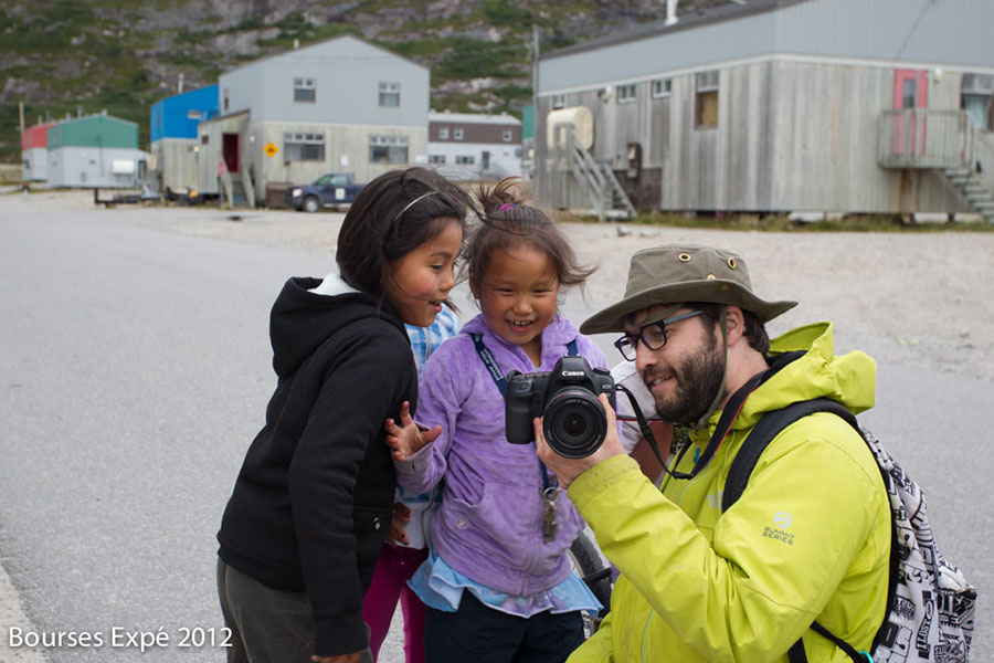 KOROC - 28 juillet. Simon avec des petites filles du village. Kangiqsualujjuaq. Nunavik.