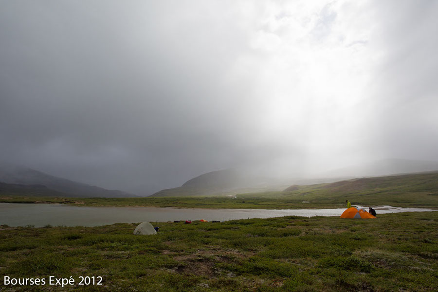 6 juillet. Après 3 heures à écouter la pluie tomber, je me décide à glisser un coup d’œil dehors. Je sais instinctivement qu’il est impossible de faire quoi que se soit de la journée. Je ne reconnais rien de l’environnement que j’ai laissé hier. La rivière fait 20 mètres de large. Il fait nuit en plein jour et un petit ruisseau coule du plateau dans les dunes en passant sous ma tente et celle de Simon. Le ruissellement dans la toundra et sur le roc montagneux est intense et la rivière fluctue donc au gré des précipitations. Pas de répit de la journée avec la météo. Nous bougerons seulement les tentes en lieu sûr, un promontoire de végétation herbacée où l’eau s’infiltre. Déluge général. Nous montons une toile dans les dunes sous laquelle nous nous faisons café et repas. Deuxième nuit de folie mais les tentes sont étanches et très bien amarrées.