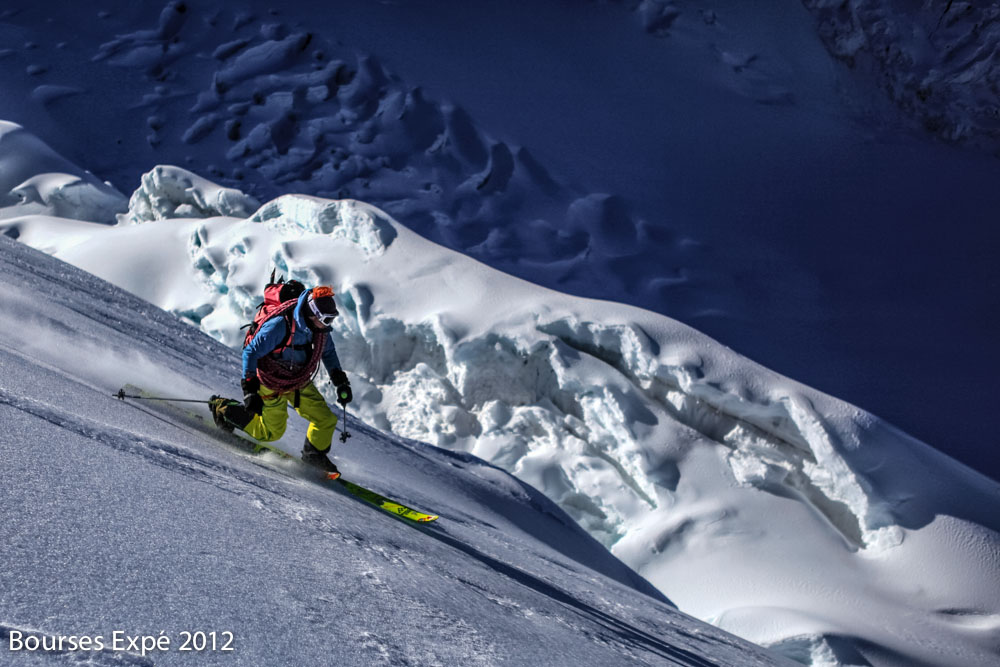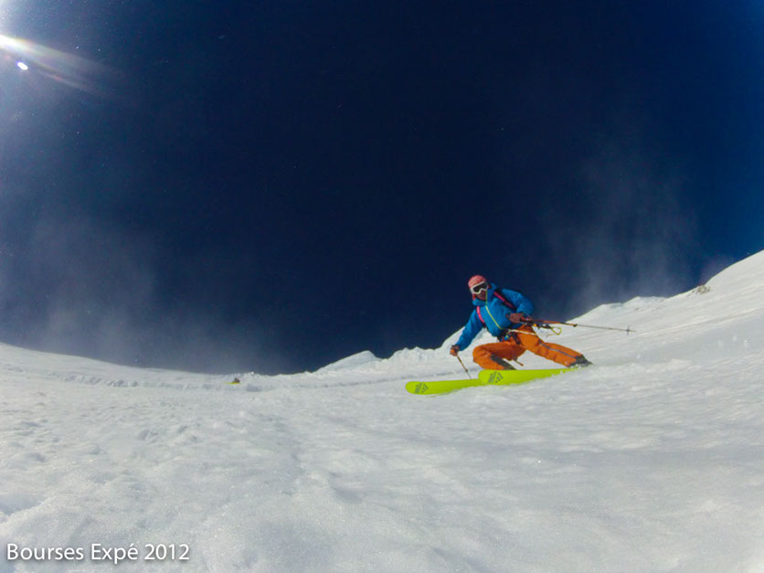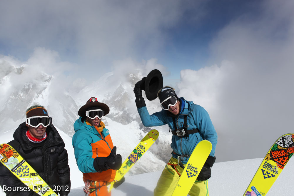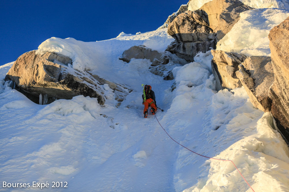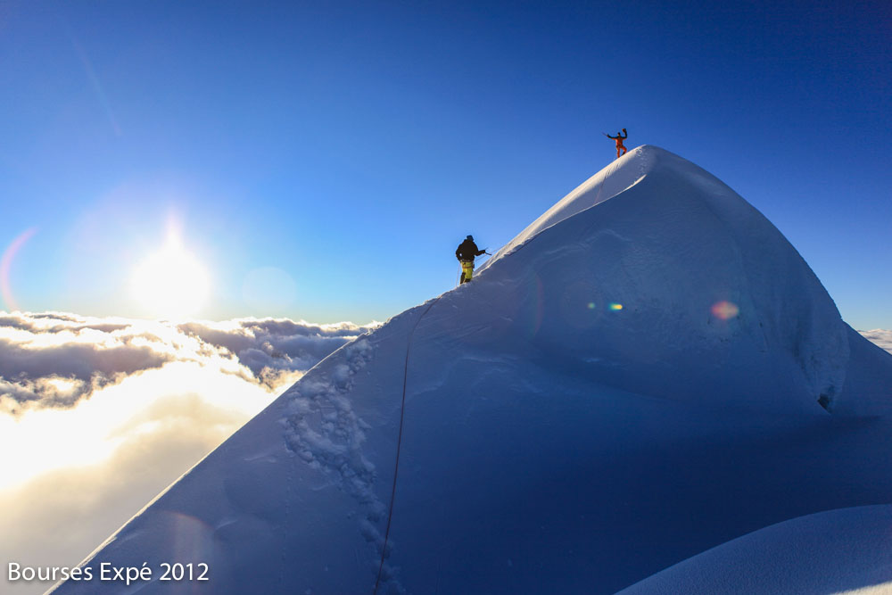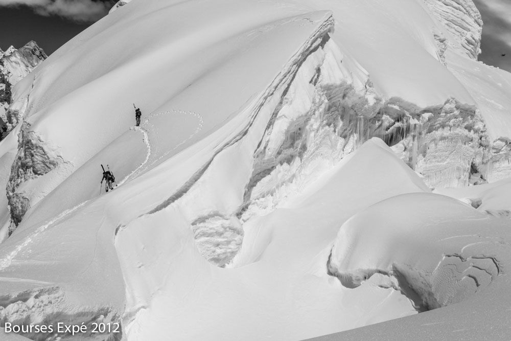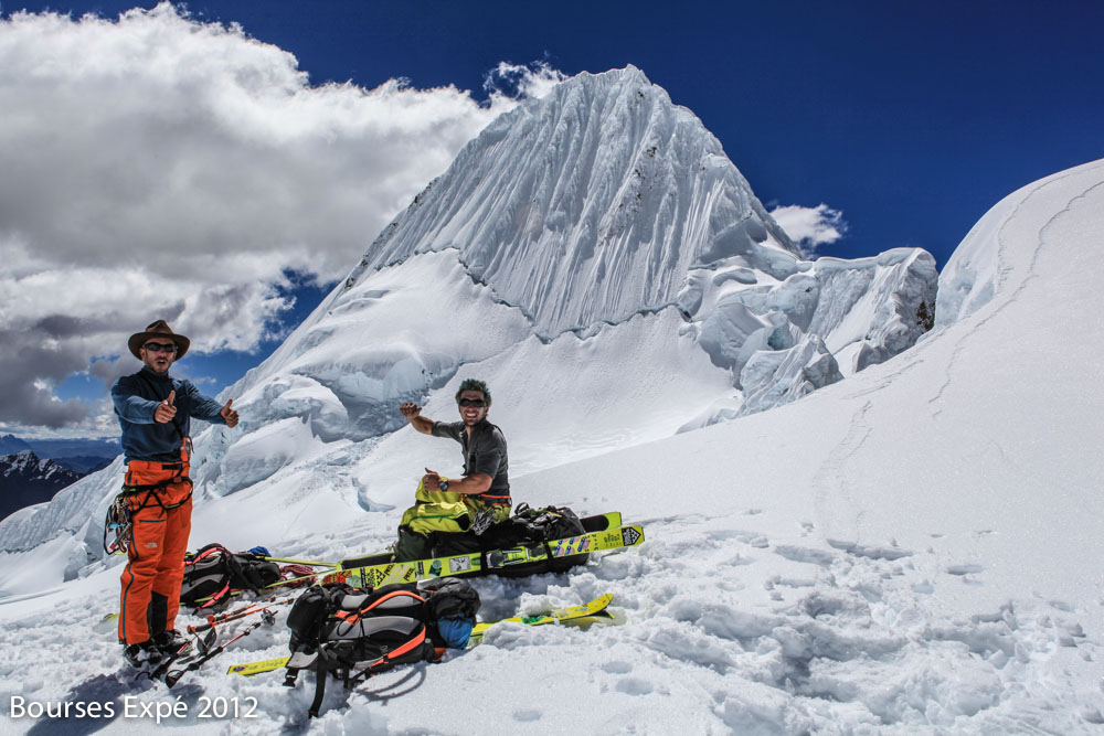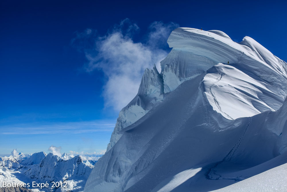 Minuit : réveil, le froid nous invite à rester plus longtemps dans nos duvets, mais l'envie est plus forte. A 5400 mètres tout est plus long ! Essoufflés de s’habiller, 10 minutes d’attente devant le jet-boil, impatients que l’eau se réchauffe pour un thé, le temps de dégivrer les skis à moins 20 degrés. Après une heure de préparation c’est le départ ! A 3h30 nous sommes à la rimaye, au pied de la voie des Français, on se dit qu’elle est pour nous cette voie ! Rapidement nous remontons la moitié de la face en neige dure. Dans la deuxième partie, la glace est bien présente, et notre progression est ralentie. Puis nous retrouvons juste sous le sommet une longueur d'anthologie, un iceflut à 70°, qui se resserre au point de former un dièdre, où l'on peut grimper en écart, piolets et crampons dans de la neige tendre. Il est 8h30, nous sommes au sommet de l'Alpamayo à 5970 m, un moment fort pour la cordée ! Quelques photos souvenir, le temps de profiter de ces instants, et du paysage. Nous traversons une arête bien enneigée, esthétique et aérienne, à force de brasser on rejoint la voie « Ferrarri » qui va nous permettre de redescendre. La face est glacée, ce qui nous oblige à alterner rappels et désescalades. Tant bien que mal, nous pouvons chausser les skis pour les 100 derniers mètres de la voie. Un petit saut de rimaye skis aux pieds, quelques courbes de plaisir, et quand on arrive au camp, on peut regarder cette face différemment, la « voie des Français » est dans notre poche !