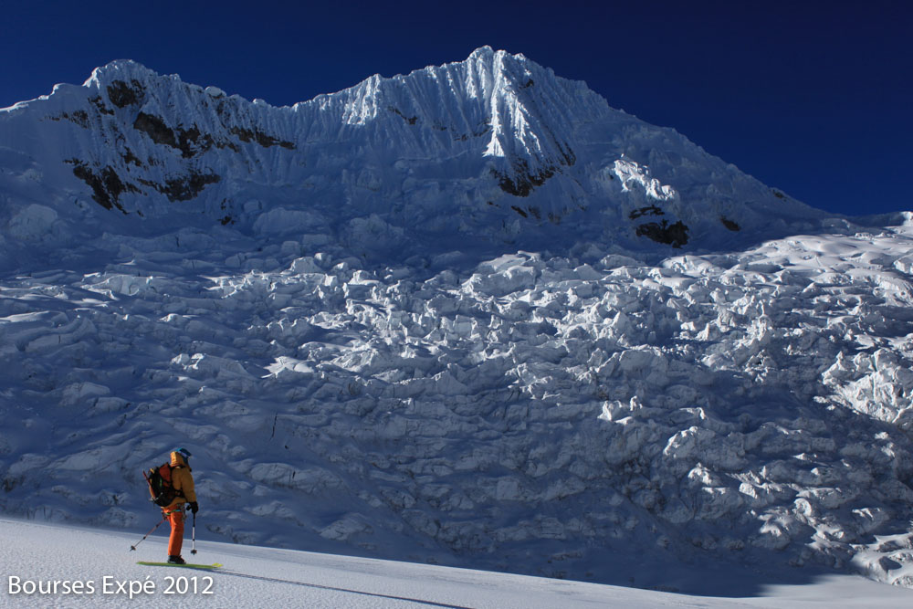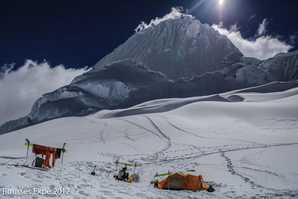 Policarpo notre porteur, haut comme trois pommes, atteint le camp de base avec 40 kilos sur le dos, une belle leçon de courage. Le camp d'altitude installé au pied du glacier, à 4800 m, nous assistons à un très beau coucher de soleil sur l'Artesonraju. Malgré la motivation, dur dur de mettre le réveil à minuit. Quelques heures de sommeil, un petit déjeuner dans notre tente et rapidement on traverse le glacier pour rejoindre le pied de la face, un slalom de nuit entre les séracs et crevasses, et déjà le vent qui commence à se faire bien ressentir. Cachés dans la rimaye, nous avalons un lyophilisé hachis parmentier, et on accède à la pente supérieure, où plus rien ne nous protège du vent à part la capuche de notre Gore-Tex, la lutte commence, les rafales sont de plus en plus violentes, à 5600 m on comprend que nos chances d'atteindre le sommet s'envolent, alors que le soleil se lève sur les montagnes, le vent a sculpté et durci la neige impossible de skier. Nous décidons de redescendre en désescaladant jusqu'à la rimaye, nous chaussons les skis, quelques courbes entre les crevasses, le vent soutenu à 100 km/h nous fait regagner le pied du glacier rapidement.