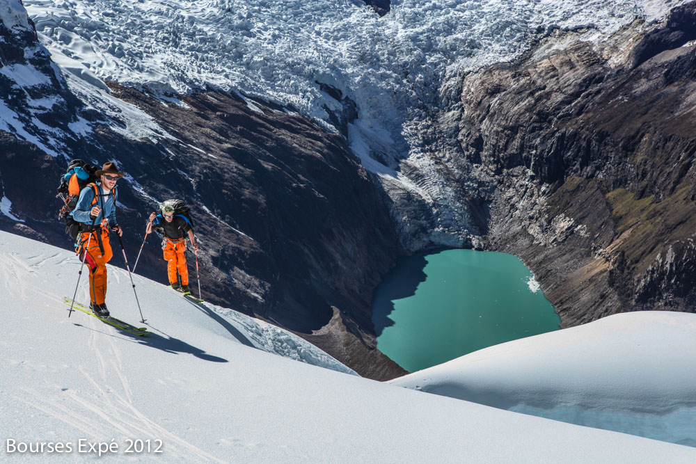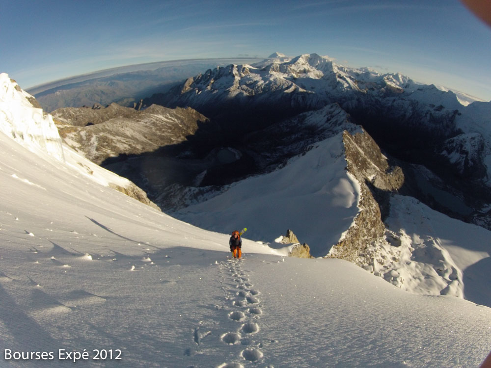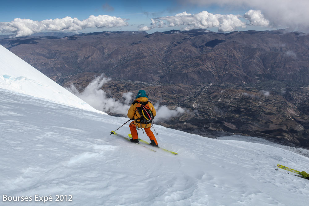 Nous continuons notre ascension, plutôt bien acclimatés nous avançons a un bon rythme. Il est 9h, bain de soleil au sommet du Chopicalqui, l’altitude de 6354 m nous offre un paysage magnifique sur l’Amazonie et toute la Cordillère Blanche. Le plaisir est de courte durée car de gros nuages bourgeonnent et nous forcent à vite chausser nos skis et à s’engager dans la descente. Pour notre dernier sommet, nous sommes récompensés, on skie dans 20 cm de poudreuse ! Après quelques grandes courbes on arrive dans le passage raide de l’arête, 100 m à 60° au-dessus d’une belle crevasse qui nous demande un peu de concentration. Tout se passe bien, nous venons de passer le dernier passage difficile de cette expé. Toute l’arête, parfaitement enneigée est un vrai bonheur, on se régale de grandes courbes ou même de godille jusqu’au pied du glacier. Nous avons pu skier de haut en bas le Chopicalqui, encore un projet de plus réalisé !