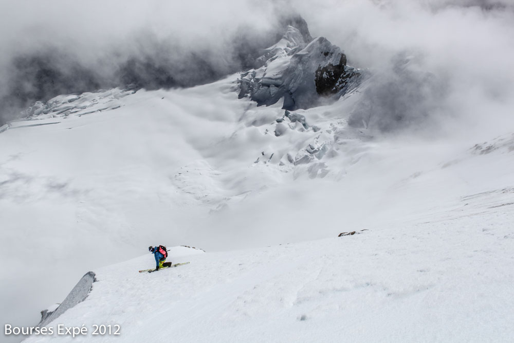 Les nuages ont pris l’entière possession de la montagne et une descente difficile nous attend. On s’engage dans la voie normale qui n’est malheureusement pas facile à trouver sans visibilité. Rapidement nous sommes perdus dans un chaos de séracs où notre sérénité est mise à l’épreuve. C’est à tâtons que nous descendons, la trouille au ventre au milieu des cathédrales de glace. 2 heures de course d’orientation désagréable et nous retrouvons enfin la voie normale. Nous passons rapidement le passage exposé au séracs, une fois de plus les skis nous sont bien utiles, en 15 minutes au lieu de 3 heures pour une cordée classique à la montée, nous traversons le champ de séracs de la « Gargantua ». Nous glissons alors jusqu’à la tente. Il est 15h30, nous sommes plus que fatigués, mais encore une fois tellement contents !