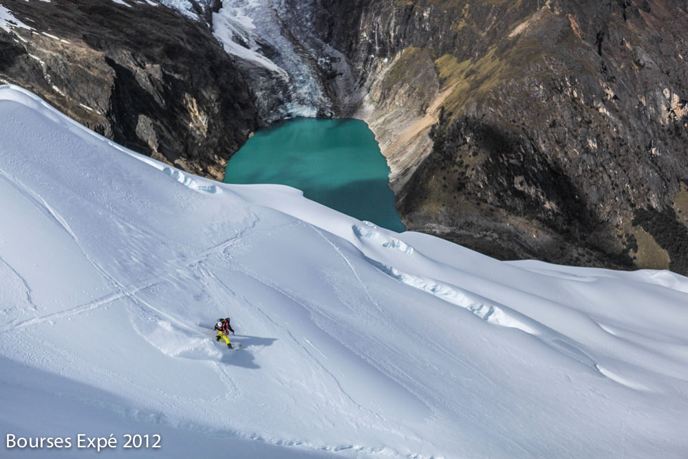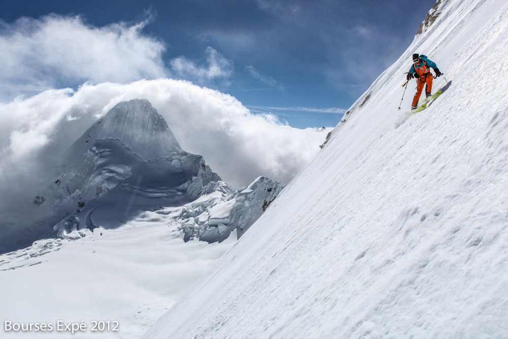 Le soleil est plus fort que les nuages, il fait décailler la neige dure, et après un rappel pour éviter la partie raide du haut de la face, les skis aux pieds on attaque la descente, concentrés, une première partie à 50° un peu exposée, mais les virages s'enchainent bien. Dans la deuxième partie la pente se raidit à 55°, sous les skis ça commence à faire ! Pendus dans les piolets pour les photos et vidéos ! On reste bien présents sur les skis et sans rien lâcher jusqu'en bas, une fois la rimaye passée, c'est la libération, trop heureux d'avoir pu grimper et skier un si beau sommet. Enfin tous les éléments étaient avec nous. Un peu fiers aussi d'avoir skié sur les traces de Jean-Marc Boivin et son fameux bandana rouge, un grand Monsieur de la pente raide qui a ouvert à ski en 1978, cette face nord du Quitaraju...