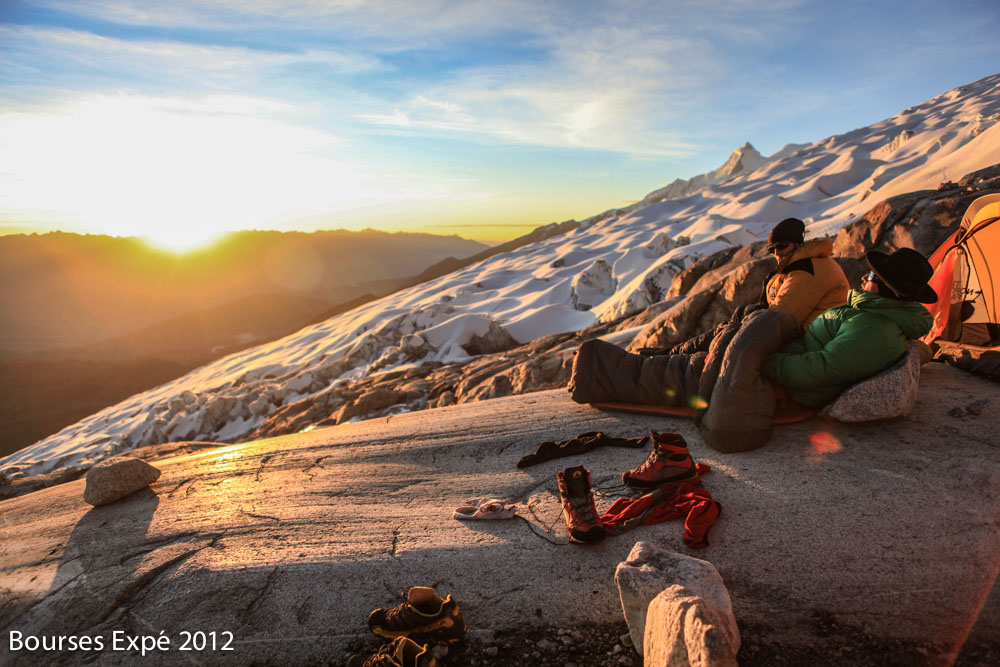 Sylvain et Théo au coucher de soleil au camp moraine du Huascaran Sud 6768m. Photo Matthieu Portefaix.