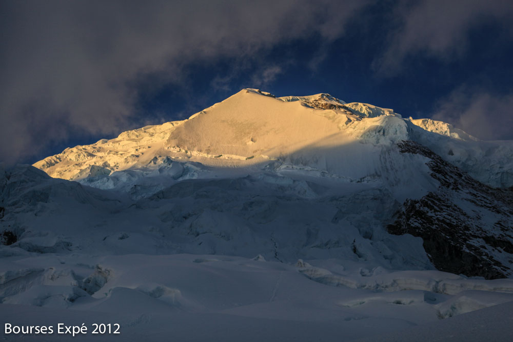 Pour lutter contre ces chutes de neige et le vent, on se cache alors dans un chaos de blocs en attendant que la tempête se calme. Une soupe, un lioph, un carré de chocolat et au lit. Minuit, comme d’habitude le réveil sonne, les nouvelles sont bonnes : il ne neige plus, il fait même grand beau, nous décollons à 1 h du camp, à la frontale. La première partie de l’ascension se déroule sur le glacier, où il nous faudra 4 h pour rejoindre l’arête poudreuse qui nous guidera jusqu’au sommet. De l’arête nous assistons à un beau spectacle, à l’est, au loin, sur l’Amazonie, un violent orage éclate, de nuit, les dizaines d’éclairs illuminent un ciel orangé.