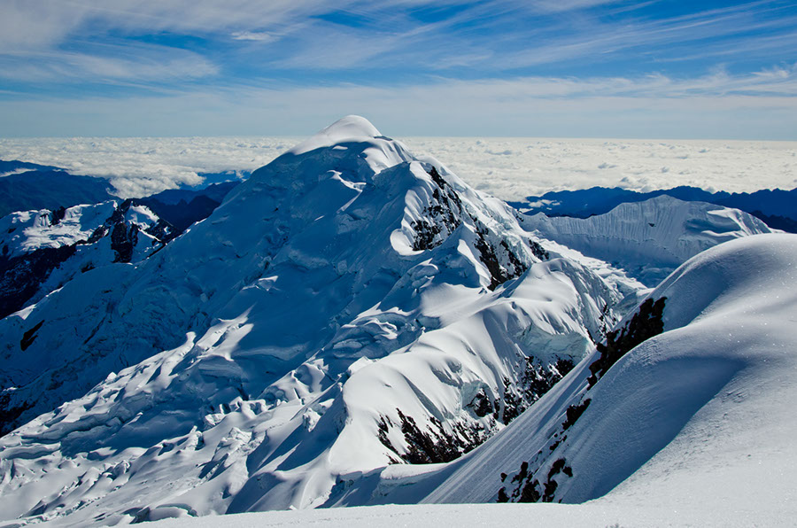 À peine le temps de profiter d’un panorama unique que nous enchaînions le second défi de la journée : une descente de 600m de dénivelé jusqu’à un plateau séparant les deux sommets et une nouvelle ascension de près de 3h30 pour arriver sur une belle arrête, le tout dans un brouillard épais à 5700 m d’altitude !