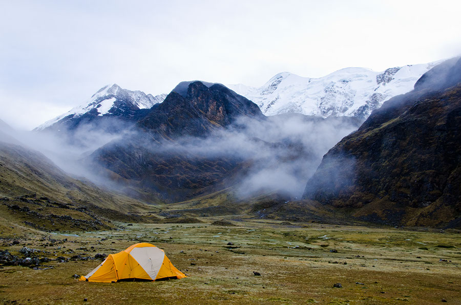 Les deux premiers jours de l’aventure ont été marqués par un taux d’humidité proche des 100%. C’est avec une visibilité quasiment nulle que nous progressions dans ces vallées inconnues. Une fine bruine bretonne à environ 4000m d’altitude réduisait à néant nos chances d’effectuer notre première ascension prévue le deuxième jour. Nous décidions alors d’annuler cette ascension, convaincus de trouver un autre sommet à gravir pendant l’expé étant donné la richesse de l’environnement.