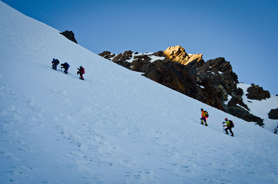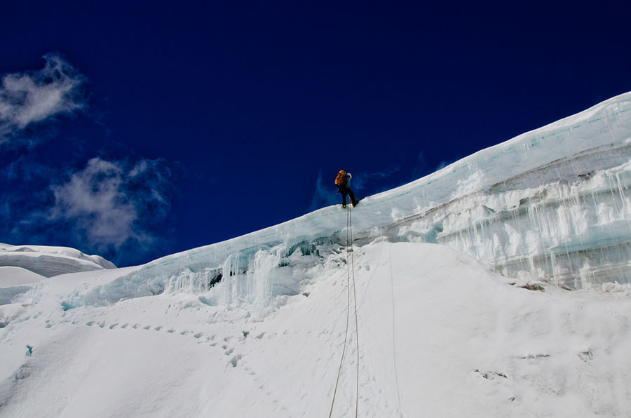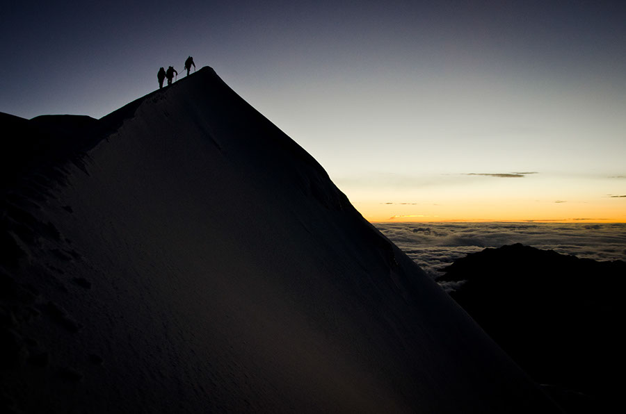 Déjà que le sommeil est léger en altitude, il est en plus extrêmement court lors des nuits d’ascensions… 3 petites heures de sommeil seulement avant de s’attaquer au Cololo, ou Anta Kwaja. Un sommet que tous les amoureux de la Haute Montagne rêvent de gravir. Une ultime paroi magnifique, raide sur 150m, à 75° d’inclinaison, pour atteindre un pic en forme de cône semblable aux Annapurna. Dans un froid glacial, de nuit, les regards orientés vers le sol, telles des machines, sans vraiment réfléchir, nous avancions ensemble, pas à pas. Durant ces instants, où la possibilité de puiser de l’énergie dans la beauté des paysages qui nous entourent est impossible, nous nous devions d’occuper notre esprit afin d’oublier la douleur, la fatigue et même parfois la peur…