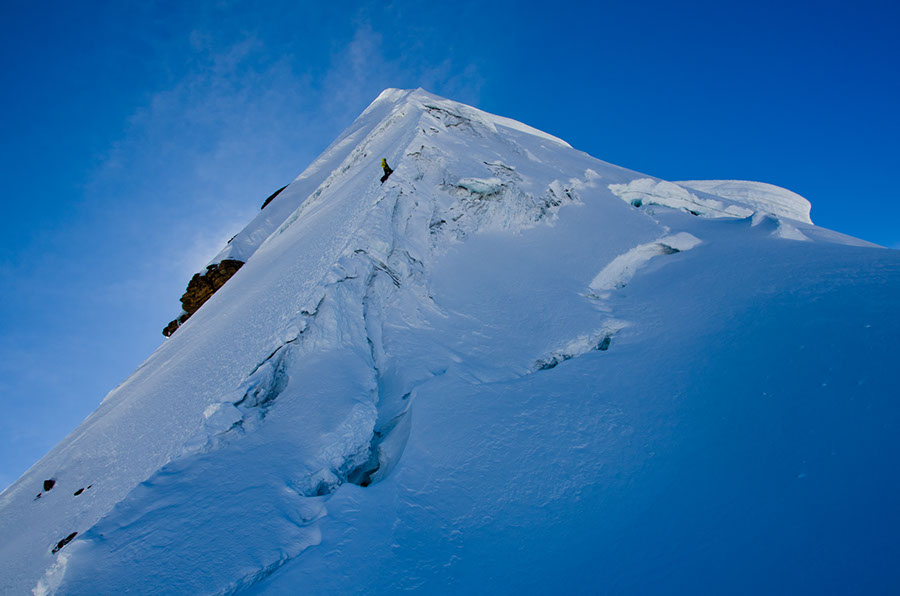Le Chaupi Orco est composé de deux pics, le Nord et le Sud : les guides auraient voulu réussir à faire la traversée joignant ces deux cimes, mais c’est une fois au sommet, à 6070m d’altitude, après 8h20 d’ascension, 8570m de dénivelé positif accumulés en 10 jours, dans un froid glacial, que raisonnablement, ils ont décidé d’oublier cette possibilité et de redescendre vers le camp de base.
